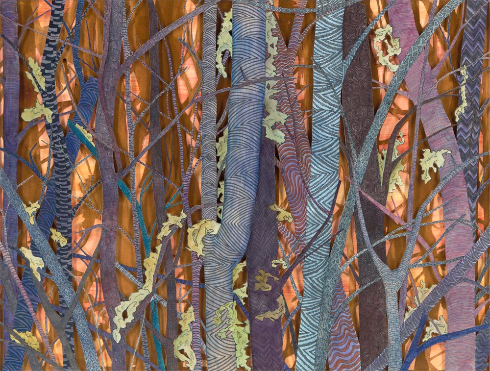Into the Woods. 22 x 30 on Hard press Watercolor paper. Mixed media: ink, acrylic paint, and foam board.